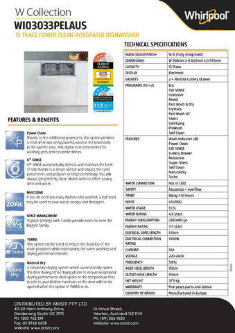 Whirlpool Floor Stock WIO3033PELAUS 60cm 15 Place Power Clean Integrated Dishwasher