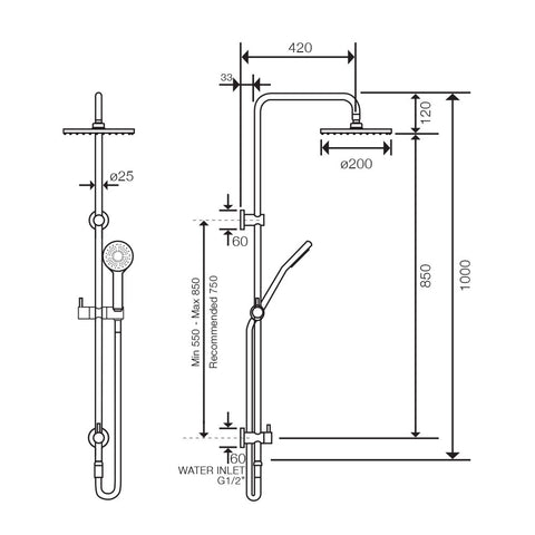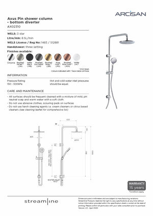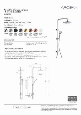 The Axus shower column is fitted with a 200mm round shower head and comes with a three setting hand shower and bottom water inlet and diverter.