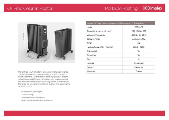 A portable radiator design giving you a warm room faster when compared to an equivalent Dimplex Oil column and more energy efficient when used to reach 20 degrees. The turbo fan allows for instant heat and less fins, reducing the carbon footprint and making the unit 10% lighter. Easy to move with a free end panel with a handle and storage to keep the cable neat and tidy. By removing the oil, heating a room becomes more efficient, the electricity is immediately converted in to deliverable heat without having to wait for the oil to reach temperature.- Oil Free and Lightweight