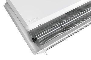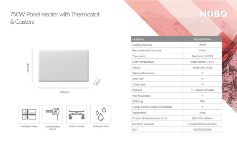 The 750W Nobo electric panel heater with ultra-accurate thermostat shares the Scandinavian design ethos: to combine clean and timeless models with user-oriented functionality. The Nobo heaters conceal the heat outlet vents behind the front panel, removing visual clutter and blending in against your wall. This clever design also means Nobo panel heaters can be installed almost anywhere, including behind furniture, where others may not work effectively. The silent performace means you'll have no fans, clicking mechanical thermostats or moving parts to take you away from your rest and the fan free technology won't circulate dust or allergens, which may reduce air quality. For safety, these heaters are fitted with a tilt switch to stop operation if knocked over. Another reason to trust in the Nobo Advantage.- Child Lock Safety