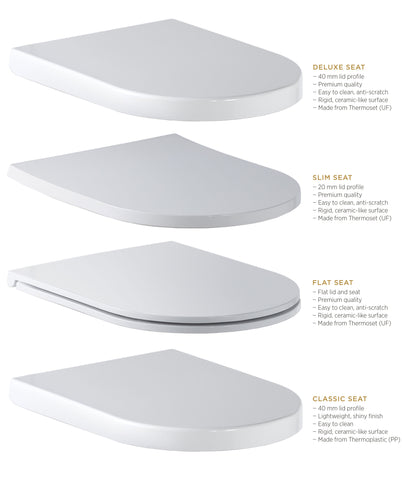 • Available Toilet seats: Deluxe, Slim, Classic and Flat seat (Found in the specification sheet)