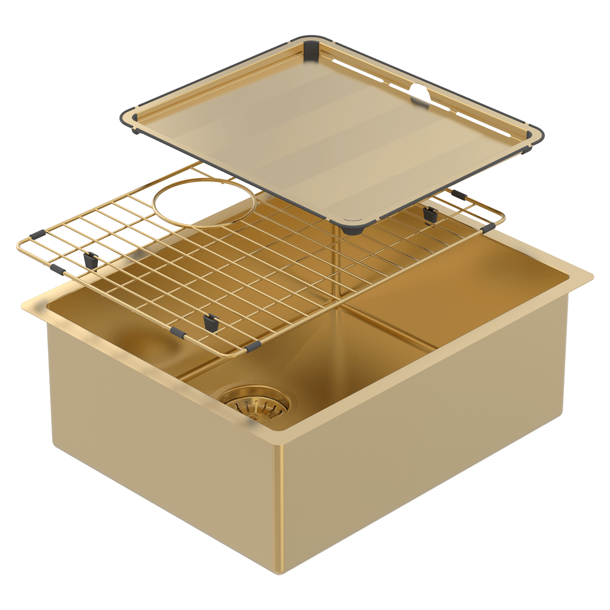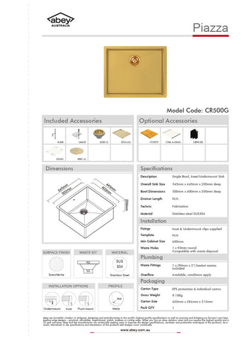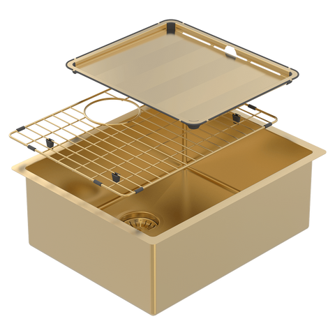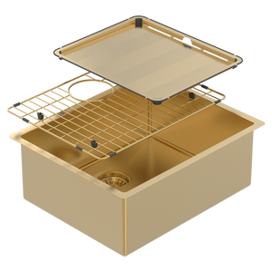 Our Piazza Finished sinks are achieved through a process called ‘Physical Vapor Despositon (PVD)”. The process ensures a coating that is both scratch resistant and impact-resistant. Each sink comes with a matching drain tray and protective grid in your chosen finish.