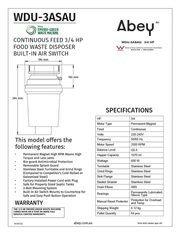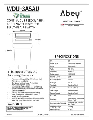 Abey WDU-3ASAU Enviro-Green Waste Machine 3/4 HP Built-in Air Switch