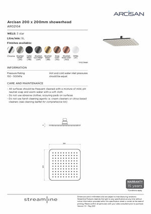 This Arcisan shower head is a 200x200mm square shower head and suits any of the Arcisan shower arms. Available in a large range of colours and finishes.