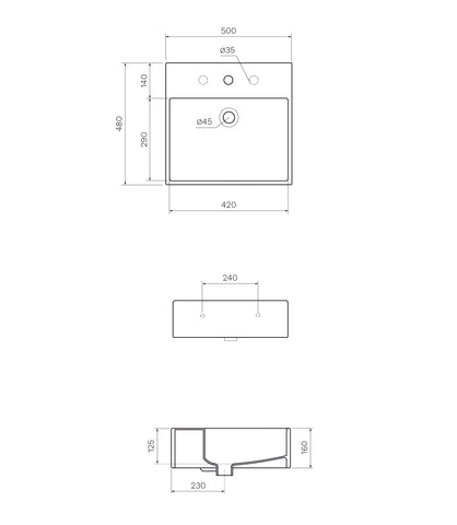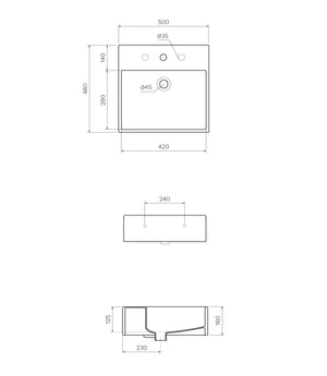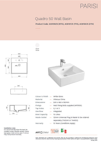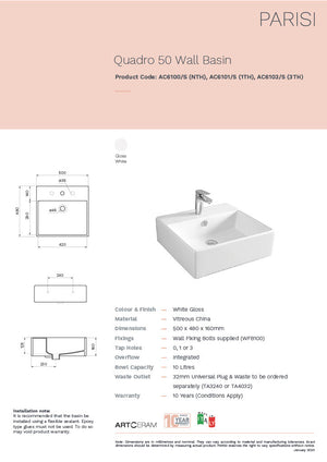 The Quadro 50cm Wall Basin has a slimline rim with a sturdy tap landing making this basin both functional and stylish.