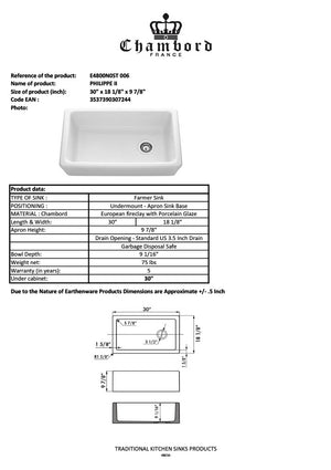 Chambord PHILIPPE-2W 762mm White Ceramic Single Bowl Sink