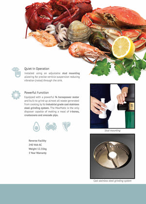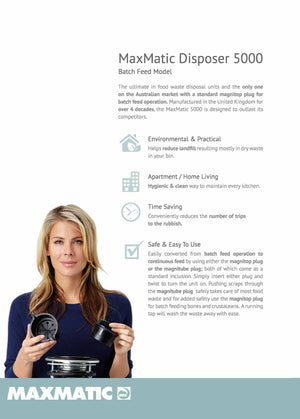 The MaxMatic is the ultimate in food waste disposal units and the only one on the Australian market with a standard Magnitop Plus for batch feed operation. Manufactured in the United Kingdom, the MaxMatic 5000 is designed to outlast its competitors. The MaxMatic is equipped with a powerful ¾ horsepower motor and built to grind up almost all waste generated from cooking.