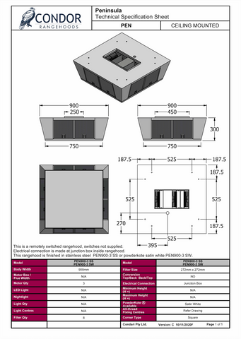 - PEN 900-3 SS (Remote Switch - Stainless Steel - 900mm Triple motor Island rangehood, top ducted)