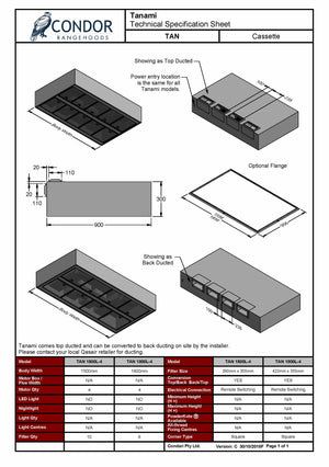 - TAN 1500L-4 (Comes with Remote Switch 1500mm Four motor ceiling cavity rangehood, Top / Back ducted)