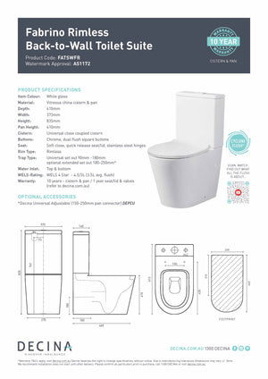 All Decina toilets are made to Australian Standards with a 4 Star WELS Rating. They are made with high gloss white, quality vitreous china and backed by a 10 year warranty.