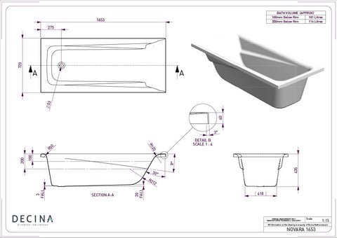- NT1665W (Inset Bath) - 1665 x 735 x 447 (mm) - 114 litres