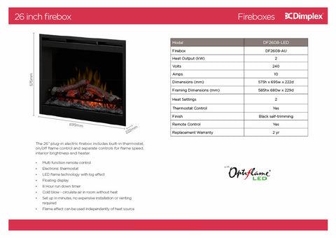 The 26" plug-in electric firebox features our Optiflame LED technology. The pulsating embers with hand finished logs molded from real wood logs offer incredible realism. It includes built-in thermostat, on/off flame control and separate controls for flame speed, interior brightness and heater. Set up in minutes, no expensive installation or venting required. The flame effect can be used independently of heat with the safe, cool to touch glass.- Optiflame Technology with log effect