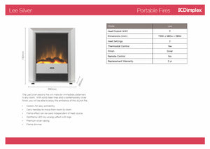 The Lee Silver electric fire will make an immediate statement in any room. With solid clean lines and a contemporary silver finish, you will be able to enjoy the ambience of this stylish fire. The Flame effect can be used independently of the heat source. The Lee Silver can be fully portable with castors and carry handles to move between rooms- Optiflame LED with log effect