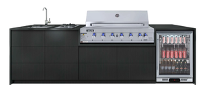 - Includes a 6 Burner Hooded BBQ + Rotisserie, 138L Single Door Beverage Cooler, Under/Top Mount Single Bowl Sink, Gooseneck Sink Mixer, 30cm Gas Wok Burner