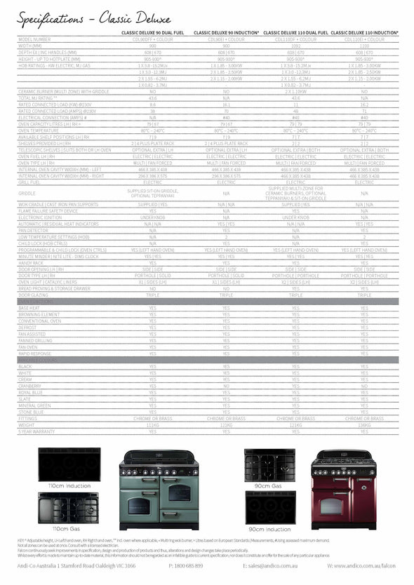 Falcon’s Classic Deluxe 110cm induction range cooker features three cooking cavities – a separate glide-out grill, multi function electric oven and fan forced electric oven. Plus 5 induction cooking zones with residual heat indicators and pan detectors. So when it comes to boiling, searing, grilling, baking and roasting – you can do it all at once. Talk about flexibility! For lovers of fresh bread, the Classic Deluxe 110cm also features a bread proving drawer, which also doubles as a storage drawer when not in use. With seven colours available and a choice of brass or chrome fittings, there is a Classic Deluxe to suit any kitchen.