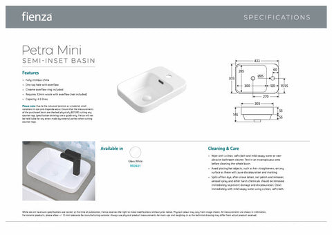 Please note: If purchasing with a Fienza stone or timber vanity top, an additional charge of RRP $140 applies for cutting the basin hole in the top.- Semi-inset into counter top