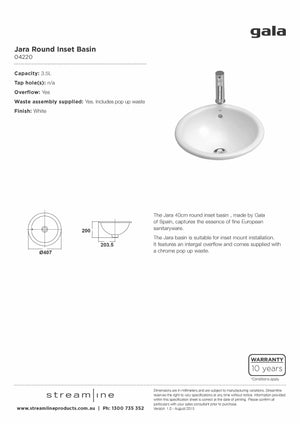 The Jara 40cm round inset basin , made by Gala of Spain, captures the essence of fine European sanitaryware. The Jara basin is suitable for inset mount installation.