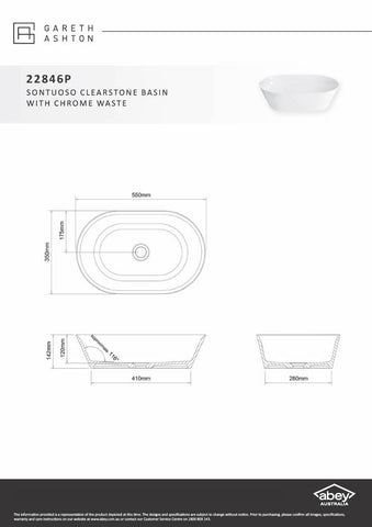Manufactured from ClearStone, using a Resin Mix including a majority Clay Mineral of Sedimentary Origin and a minority of Gibbsite Mineral as a Filler, the Sontuso Basin is a modern shape with a large basin space.