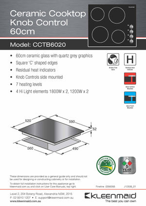 This practical ceramic cooktop is covered by Kleenmaid's full 5 year parts and labour warranty and supported by our National Service Team.