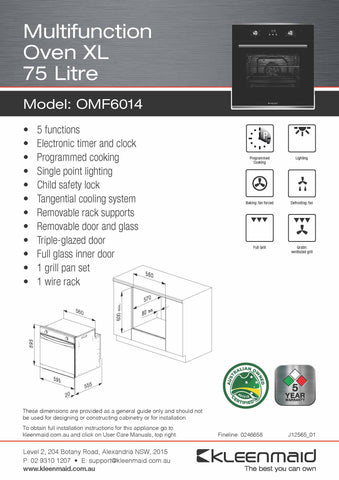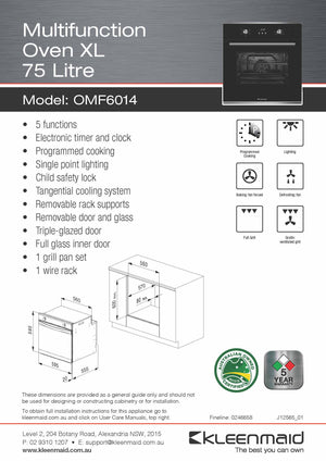 The OMF6014 Multifunction Oven is beautifully finished in stunning black glass with stylish stainless-steel trims and handle. It has a 75 litre, XL capacity for those big roast dinners and five, easy to select functions, including fan-forced cooking for perfect baking.