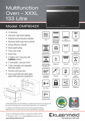 XXXL 133 Litre Multifunction Oven OMF9042X is of elegant stainless steel and black krystal glass construction. Whether you are catering for a dinner party or cooking the family Sunday roast you will love using this oven. With 12 functions including Pizza and Bread, Pastry and various Grill settings, electronic touch controls, automatic cooking, a meat probe, 4 convenient cooking levels, and Kleenmaid's thermal reflective glass ensuring the heat is retained within the oven and not lost through the glass,