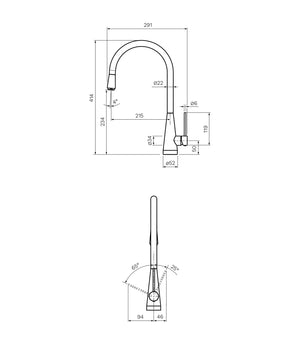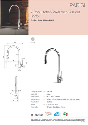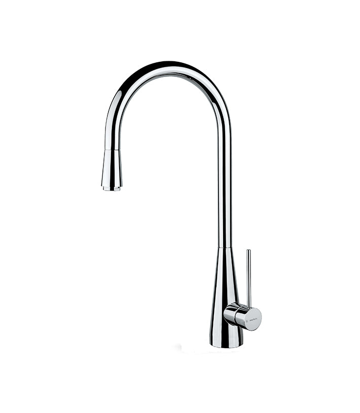 The Ycon Kitchen Mixer with Pull-Out Spray features a gently tapering base, and a tall swan neck design. This, along with its soft and smooth curves, provides a feminine touch to this elegant kitchen mixer.