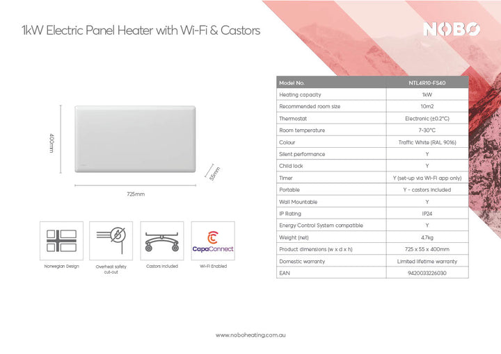 Nobo NTL4R10-FS40 1kW Wi-Fi Panel Heater with Castors