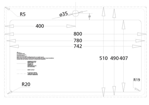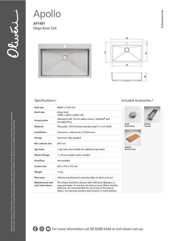 - Sink size: 800W x 510H mm