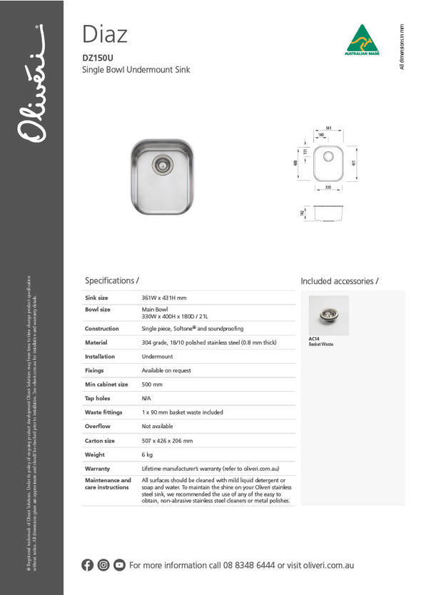 - Sink size: 361W x 431H mm