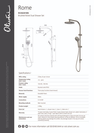 - Warranty: 15 years main body; 5 years finish; 5 years shower head, shower arm, plastic hand piece; 2 years hose, seals, o'rings; 1 year labour