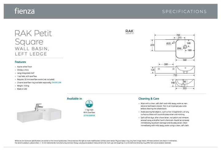 Rak Ceramics 37701AWHA Petit Left Edge Square Wall Basin
