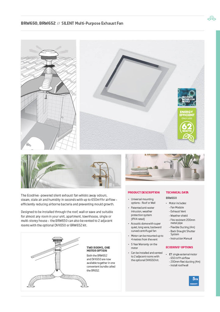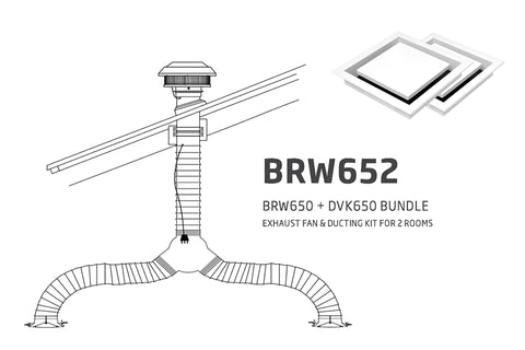 This BRW652 bundle comprises the BRW650 Silent Exhaust Fan and the DVK650 Venting Kit. It includes all you need to vent odours, steam, stale air and humidity from 2 adjacent rooms with. Please note that installing a door vent or ensuring a suitable gap below the door is essential for this exhaust fan to effectively remove steam and significantly minimize condensation in the bathroom.