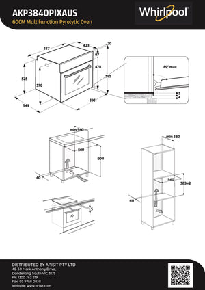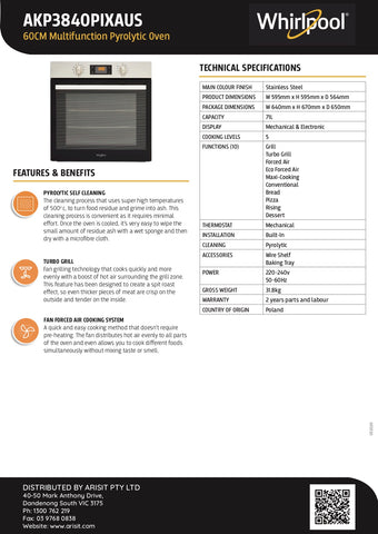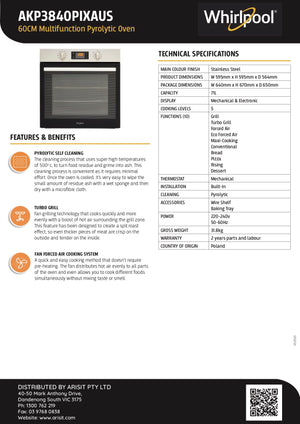 Whirlpool AKP3840PIXAUS Multi Function Pyrolitic Oven - Runout Model