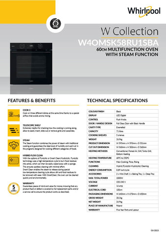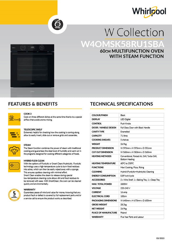 The Whirlpool 60cm Multi-Function Steam Oven in Black is the perfect addition to any modern kitchen. With a 71 Liter Capacity, this oven has enough room to fit multiple dishes at once, making meal prep easier than ever before! Its steam capabilities make cooking flavorful and healthy meals even easier, while it's seven different heating methods provide versatile cooking options for anything you might want to create. The Hybrid (Pyrolytic+Hydrolytic) Cleaning system, enamel cavity, and push control knobs make cleaning a breeze so that you can spend less time scrubbing and more time enjoying your delicious creations. The LED display allows for easy monitoring of your food while the telescopic rails provide additional safety. This oven also boasts featuring special functions such as Cook 3, Maxi Cooking, Pizza, and Rising which enable you to tailor every dish to suit your own tastes. Homeowners who are looking for an oven that will make every dish a work of art need look no further than the Whirlpool 60cm Multi-Function Steam Oven in Black – get yours now!