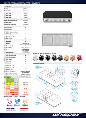 - The Whispair Monte Carlo 120 Mega Deep undermount rangehood is ideal for cooking surfaces 100cm to 120cm in width. Designed to fit in a deeper (500mm) overhead cupboard or bulkhead. Offering additional front-to-rear coverage for those with deep cookers or cooking surfaces with high-powered burners positioned toward the front of the cooktop.