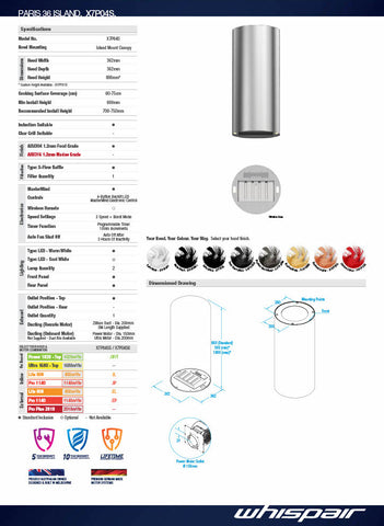 - The Whispair Paris 36 island canopy rangehood is ideal for cooking surfaces 30cm to 60cm in width. Available in custom heights (800mm standard), the Whispair Paris 36 island canopy rangehood is the ultimate interior design statement in the kitchen particularly when installed in pair.