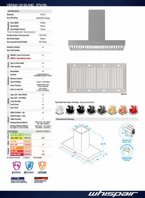 - The Whispair Vienna 120 island canopy rangehood is ideal for cooking surfaces 100cm to 120cm in width. The ‘T-shape’ design features a 75mm front fascia. The Whispair Vienna 120 island canopy rangehood continues to set the bench mark of interior design with its sleek lines and commercial-styling.